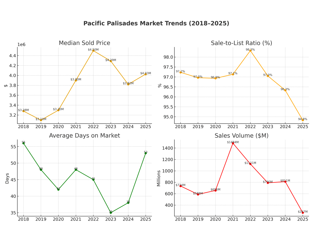 Bottom Line: Pacific Palisades is exiting its 2023–2025 correction. While turnover will remain slower than peak years, pricing resilience, family demand, and coastal prestige ensure long-term value growth, with gradual recovery in both volume and $/Sq.Ft. through 2028.